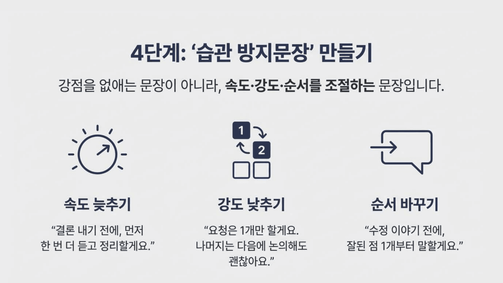 - 강도를 낮추기: “요청은 1개만 할게요. 나머지는 다음에 잡아도 괜찮아요.”