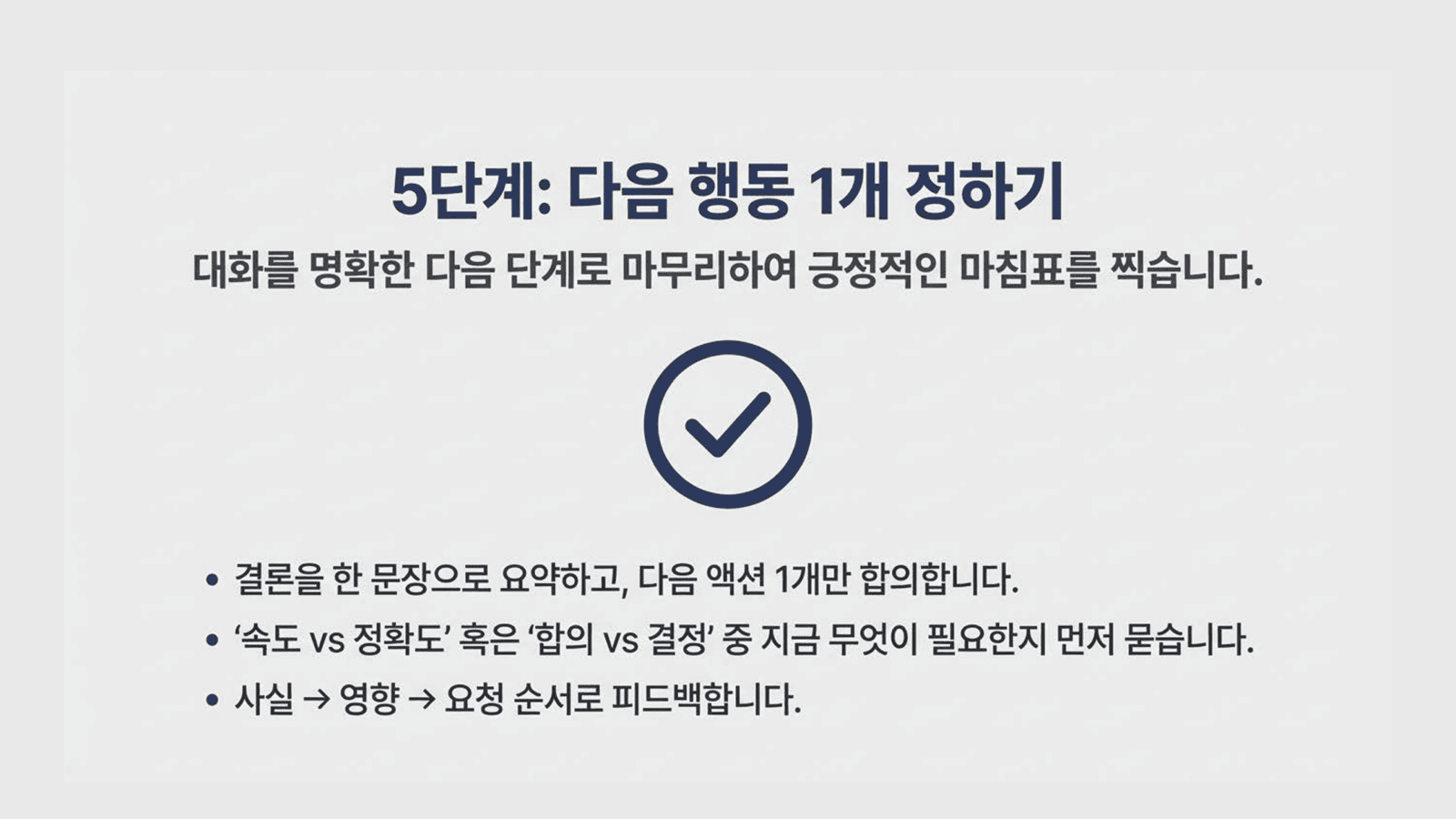 - 결론을 1문장으로 줄이고, 다음 액션 1개만 합의한다