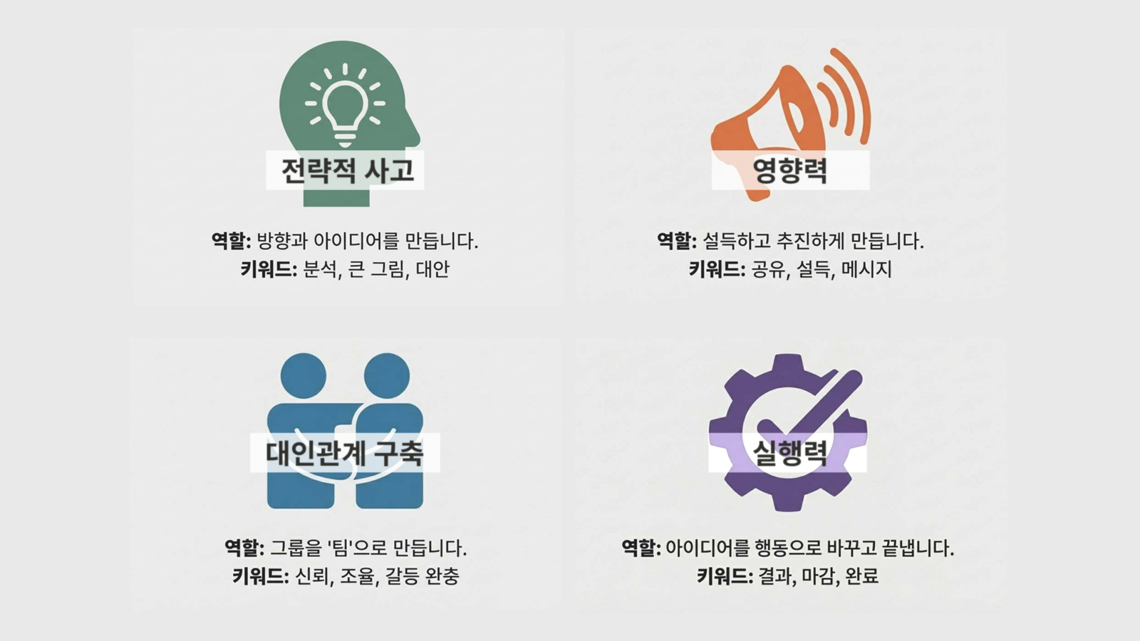 • 방향(전략적 사고) → 설득/공유(영향력) → 실행/완료(실행력) → 조율/리스크(대인관계 구축)