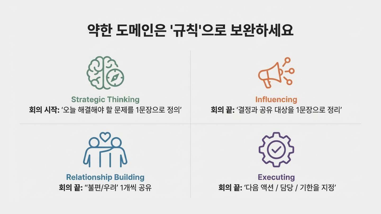 • 전략적 사고가 약하면: 회의를 시작할 때 “오늘 회의에서 해결해야 할 문제를 1문장으로 정의” 합니다.