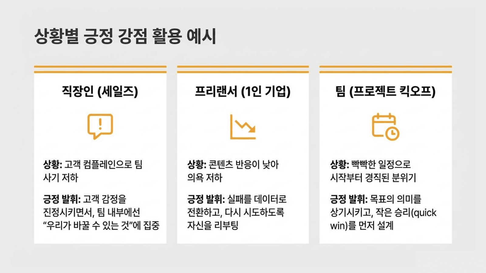• 긍정 발휘: 목표의 의미를 상기시키고, 작은 승리(quick win)를 먼저 설계