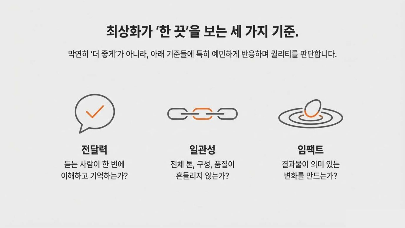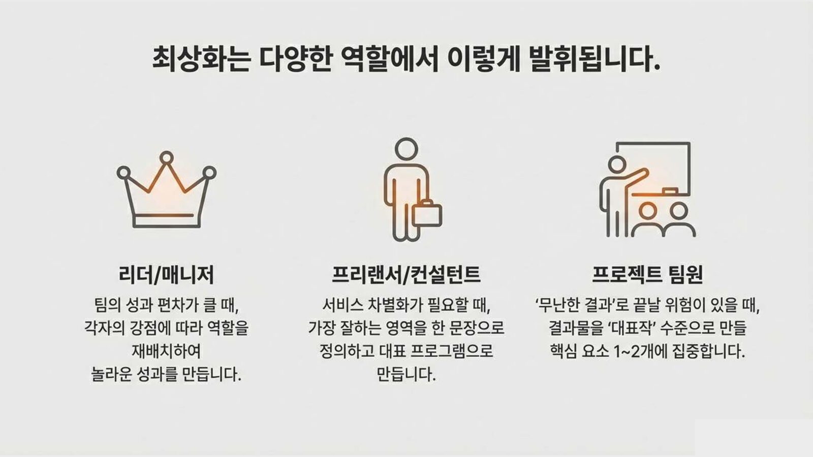 • 최상화 발휘: 결과물을 ‘대표작’ 수준으로 올릴 핵심 요소 1~2개에 집중합니다.