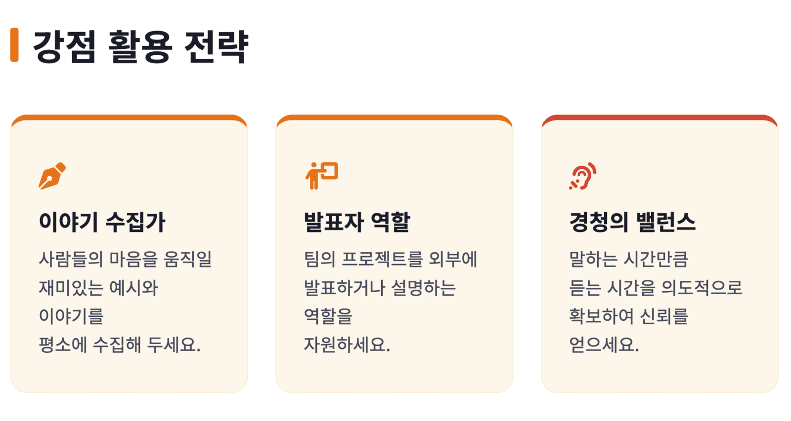 3. 이 강점은 팀에서 공감과 설득을 높이고, 아이디어를 공유 가능한 메시지로 바꾸는 데 도움이 됩니다.