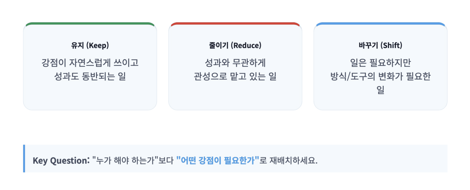 • 이 일은 “누가 해야 하는가”보다 “어떤 강점이 필요하나”로 재배치할 수 있나요?