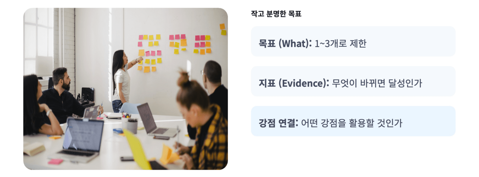 • 대신 이렇게: 분기 목표는 1~3개로 제한하고, 나머지는 “보류”로 둡니다.