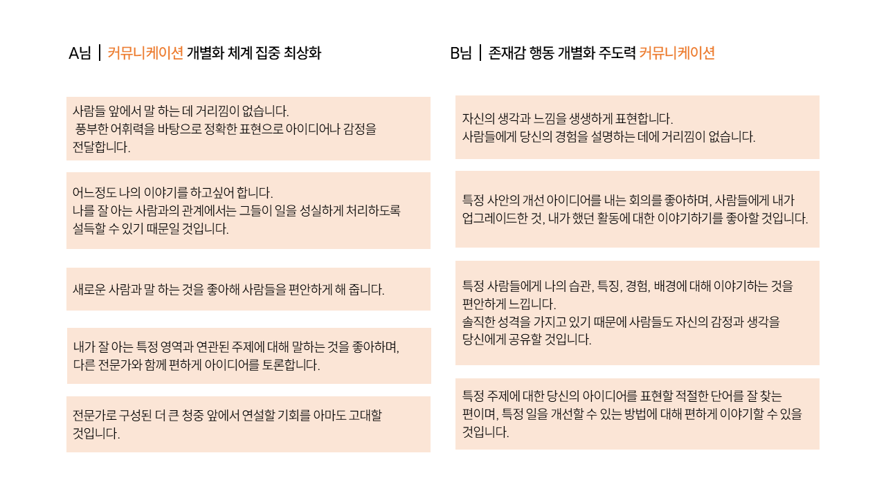 - 같은 ‘커뮤니케이션’ 테마를 가지고 있더라도, 다른 재능들과 어떻게 조합되느냐에 따라 보고서의 설명 문장이 달라집니다