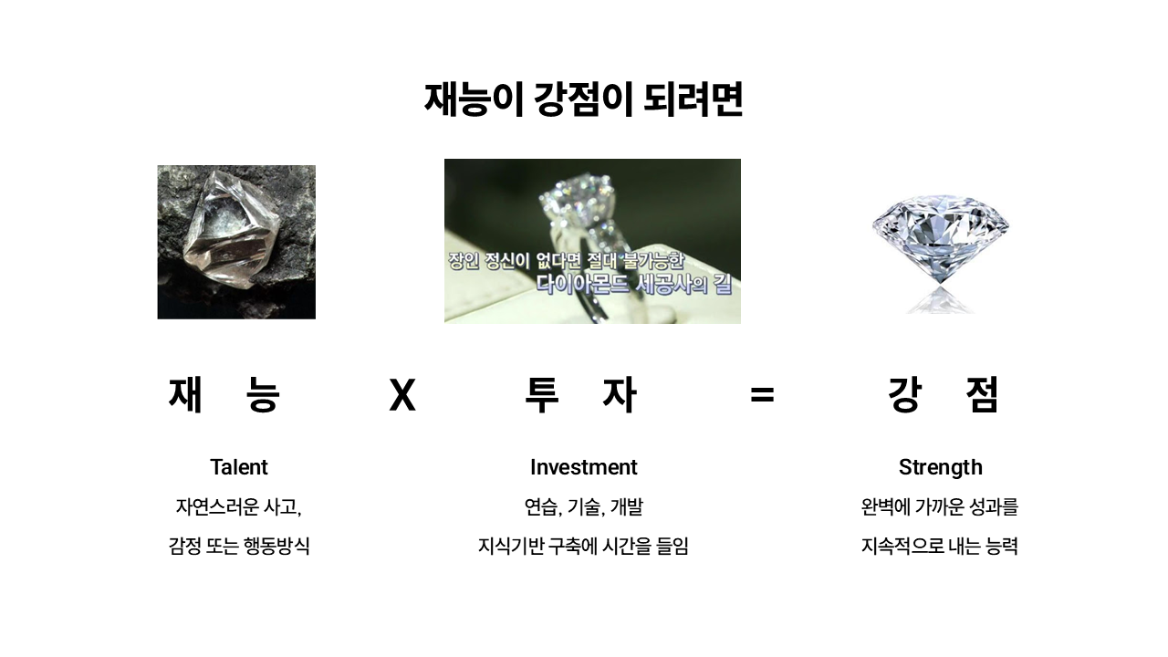 재능(Talent) × 투자(지식·기술·연습) = 강점(Strength)