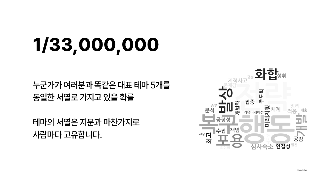 - 상위 5개 테마의 순서까지 완전히 동일할 확률은 3,300만 분의 1에 불과합니다